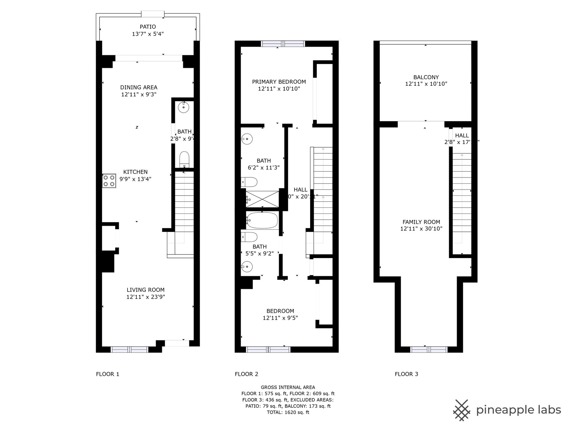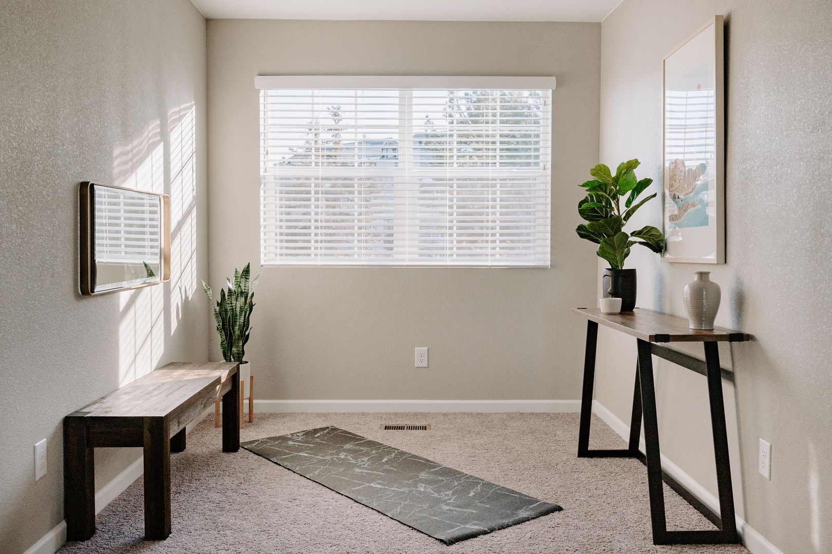 2 bedrooms and 2.5 bathrooms, and a LARGE third story flex space.